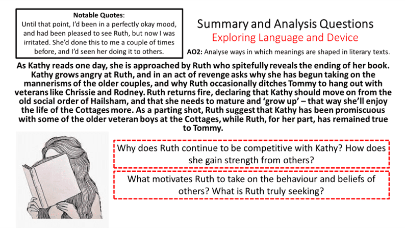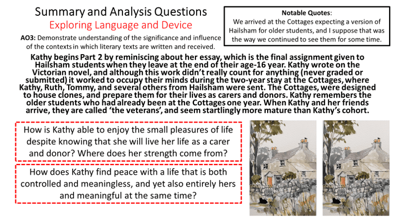 ‘Never Let Me Go’ by Kazuo Ishiguro explores an enduring love that battles a hopeless situation. Using the canvas of cloning, Ishiguro explores the moral, spiritual and legal debates connected to the creation of life. In our fractured post-modern world, this text remains both significant and essential. I have taught this text a number of times in recent years, and have used this specific resource to lead my teaching in class, as a distance learning resource (SKYPE Lessons), as a homework assignment and even as a tool of revision – all have worked well for the students.
