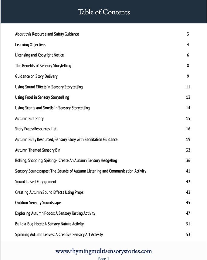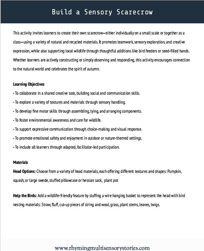 From exploring nature items, sensory boxes, and the vibrant colours, smells, textures, and taste of Autumn, listening to and creating soundscapes using everyday objects, to making sensory scarecrows, bug houses, and more… and with clear, comprehensive facilitation guidance and learning objectives, this resource supports educators, therapists, carers, and families in bringing Autumn to life.