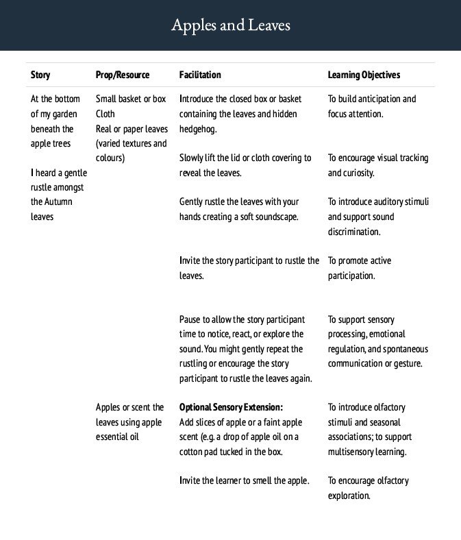 This resource has been created to support inclusive, multisensory engagement, inviting sensory learners to explore the season of Autumn through the senses—through a sensory story that weaves together tactile props, sounds, scents, tastes, and movement with simple poetic language. Rooted in a commitment to accessibility, meaningful communication, and sensory inclusion, each couplet offers a sensory prompt—guiding the story participant through a journey where every sense is welcome.