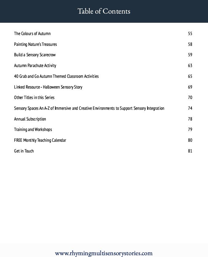 In addition to the Autumn sensory story, there are over 50 sensory-rich, thematic classroom activities, each one a hands-on invitation for learners to connect with the season through guided interaction, communication, and sensory discovery.