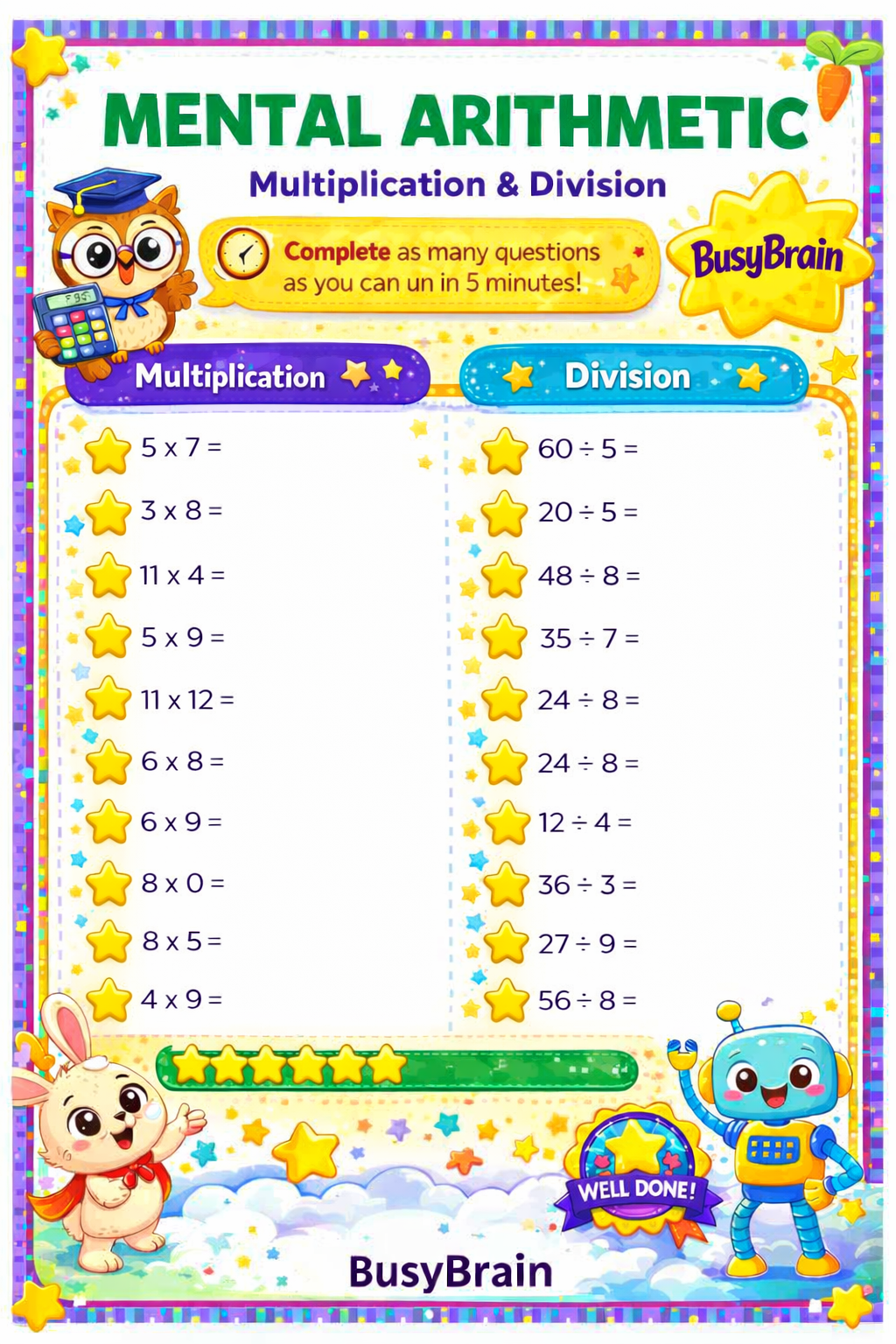 Make maths exciting with the Busy Brain Mental Arithmetic Bundle! Designed for KS1 and KS2 learners, these colourful worksheets help children build speed, confidence, and accuracy in multiplication and division — all while having fun with friendly characters and bright visuals.