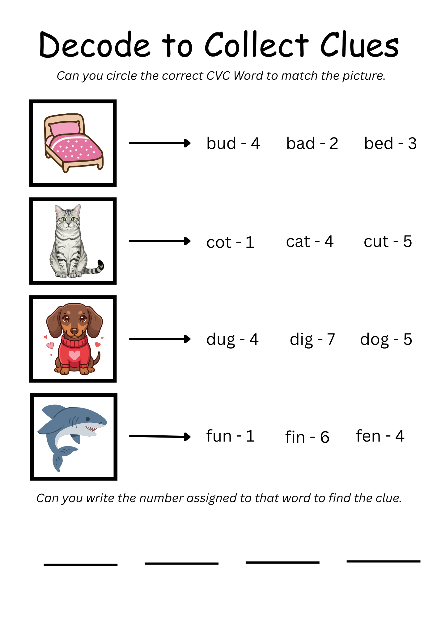 This engaging decode-to-find-the-clues activity helps children practise reading CVC words while developing careful decoding skills. Pupils look at each picture, read the word choices, and decode the sounds to identify the correct match. Each correct answer reveals a clue, which children record to help solve the final challenge.
