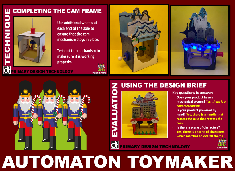 In this project, children apply their knowledge of mechanisms and in particular cam mechanisms, to design and make an automaton toy. They learn about the key features of an automaton and use this knowledge when designing and making their own product. They learn how cams can change movement in a mechanical system. When creating their automaton toy, they design the automaton character and decide the movement it will make, selecting the appropriate cam mechanism to produce this movement. They make a wooden box structure for their automaton before adding the cam mechanism and the character. Children decorate the automaton to create a scene for the automaton character. They evaluate their finished product against the design brief and design specifications and consider improvements they would make to their product. As part of the evaluation process, children create a Zine about the automaton toy they have designed and made.