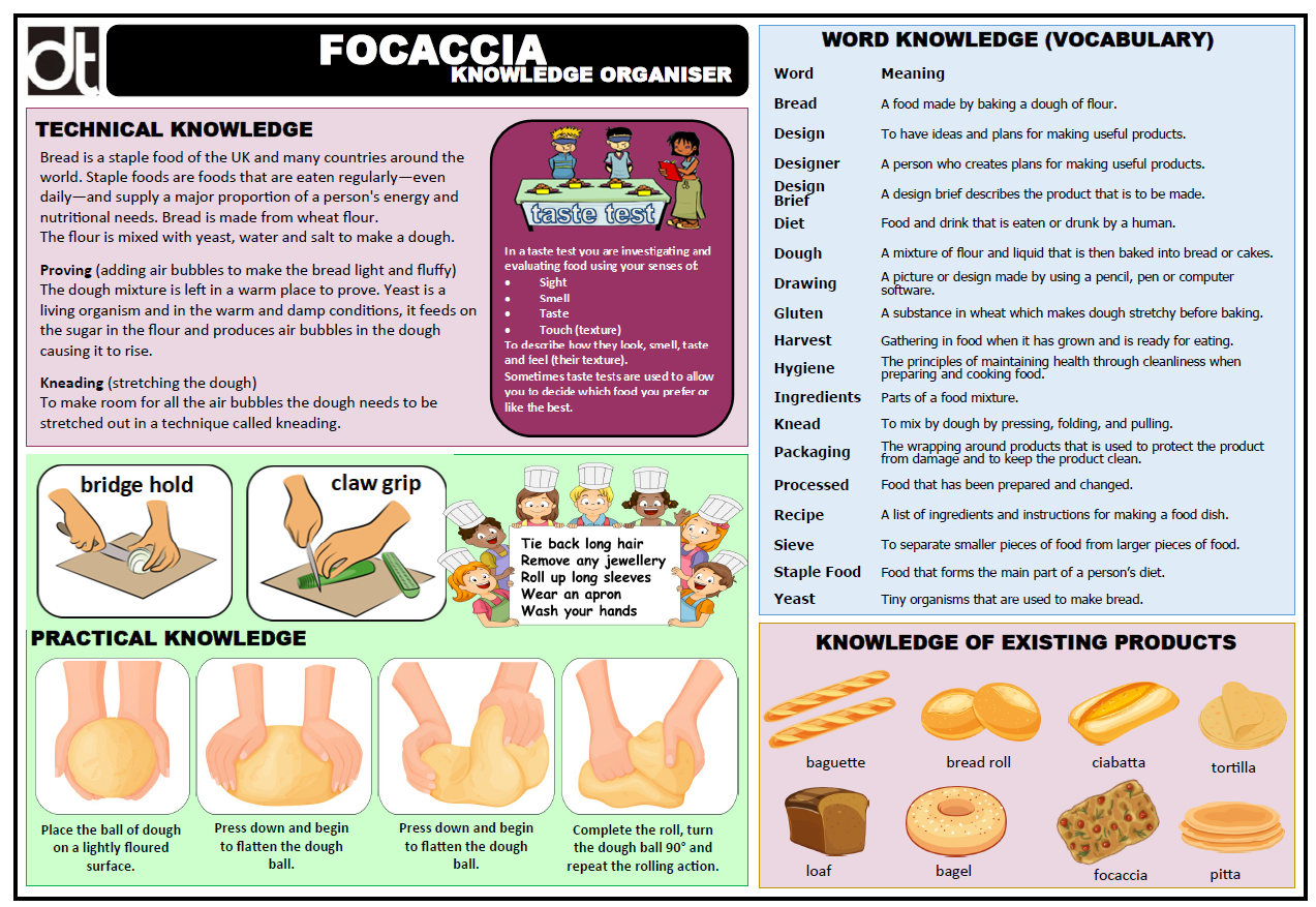 In this unit of work children learn how to make a focaccia bread product that can be used as part of a shared meal. They investigate a range of bread products from around the world and have the opportunity to taste test some breads that can be bought locally in a bakery then recording their results using a taste test recording sheet. Children learn how to follow a basic bread recipe, about the action of yeast and the importance of kneading bread. Using this knowledge, they adapt this recipe and add other ingredients to create their own focaccia bread product which is shaped to make it suitable to be shared. The completed product is taste tested and evaluated.