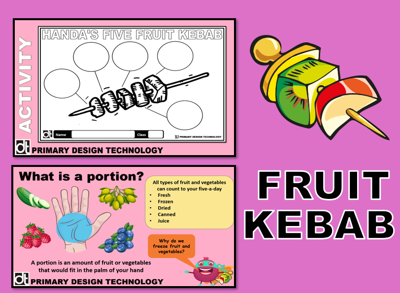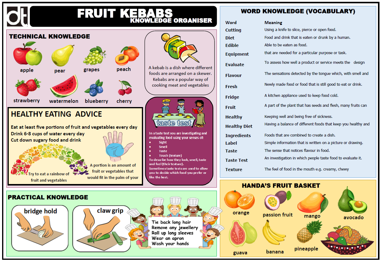 In this unit of work children design and make a fruit kebab based on the story of Handa’s Surprise written by Eileen Browne. Children learn the names of a range of fruit and investigate where fruit can be bought locally. Children learn how to cut and prepare a range of fruits. Through tasting apples, they begin to develop their taste vocabulary. This vocabulary is extended through more taste tests where the children are taught how to cut fruit using the bridge hold and the claw grip. Children are taught key healthy eating messages including eating five portions of fruit and vegetables every day, drinking lots of water and cutting down sugary foods. Having designed and made their fruit kebab they evaluate their product and the products of other children repeating using a taste test. As part of the evaluation, they write a letter from Akeyo to Handa thanking her for the gift and saying what they liked about the fruit kebab.