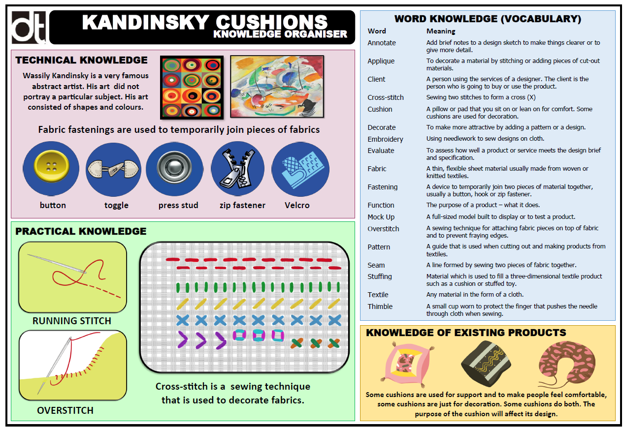 Using the design brief and specifications, they design a cushion cover based on the iconic abstract art of Wassily Kandinsky. They use learnt techniques to make a cushion and a decorative cushion cover following the designs that they made. As part of the evaluation, children consider the skills that they used in designing and making the cushion product and also present their product in a Dragon’s Den simulation.