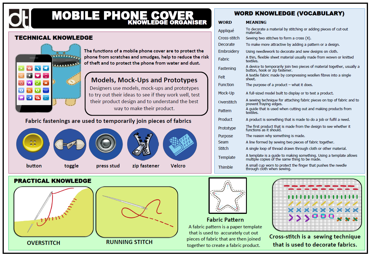 In this unit of work children design and make a mobile phone cover using textile materials. Children have the opportunity to consolidate their skills in sewing using the running stitch and are taught the technique of the overstitch. They develop their embroidery skills using Binca material and by applying a range of stitching techniques including the cross-stitch. Children learn about models and mock-ups and how designers use them to try out and test design ideas that they have. Children learn about different textile fastenings and consider which ones would be best suited to use in a mobile phone cover. They develop their knowledge of textile decorative techniques including embroidery, embellishment and appliqué to create a monster-themed mobile phone cover.