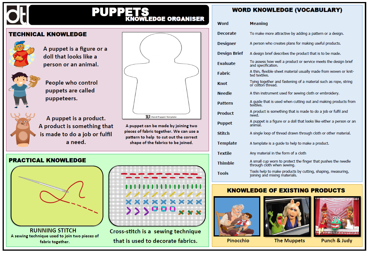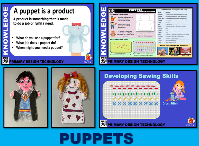 In this unit children make a hand puppet by marking out, cutting, and joining pieces of fabric together to create a character from a story book. Children learn about different types of puppets and some famous puppets such as Sooty and Sweep, and the Muppets. They understand that a puppeteer makes the puppet appear alive. They draw a puppet design based on a character from a fiction book in the school library. They learn how to thread a needle and the technique of the simple running stitch. They apply and practise the running stitch to create decorative stitching using Binca material. Stitching two identical templates together they create a basic puppet figure which they then decorate using a range of skills following their puppet design of a book character.