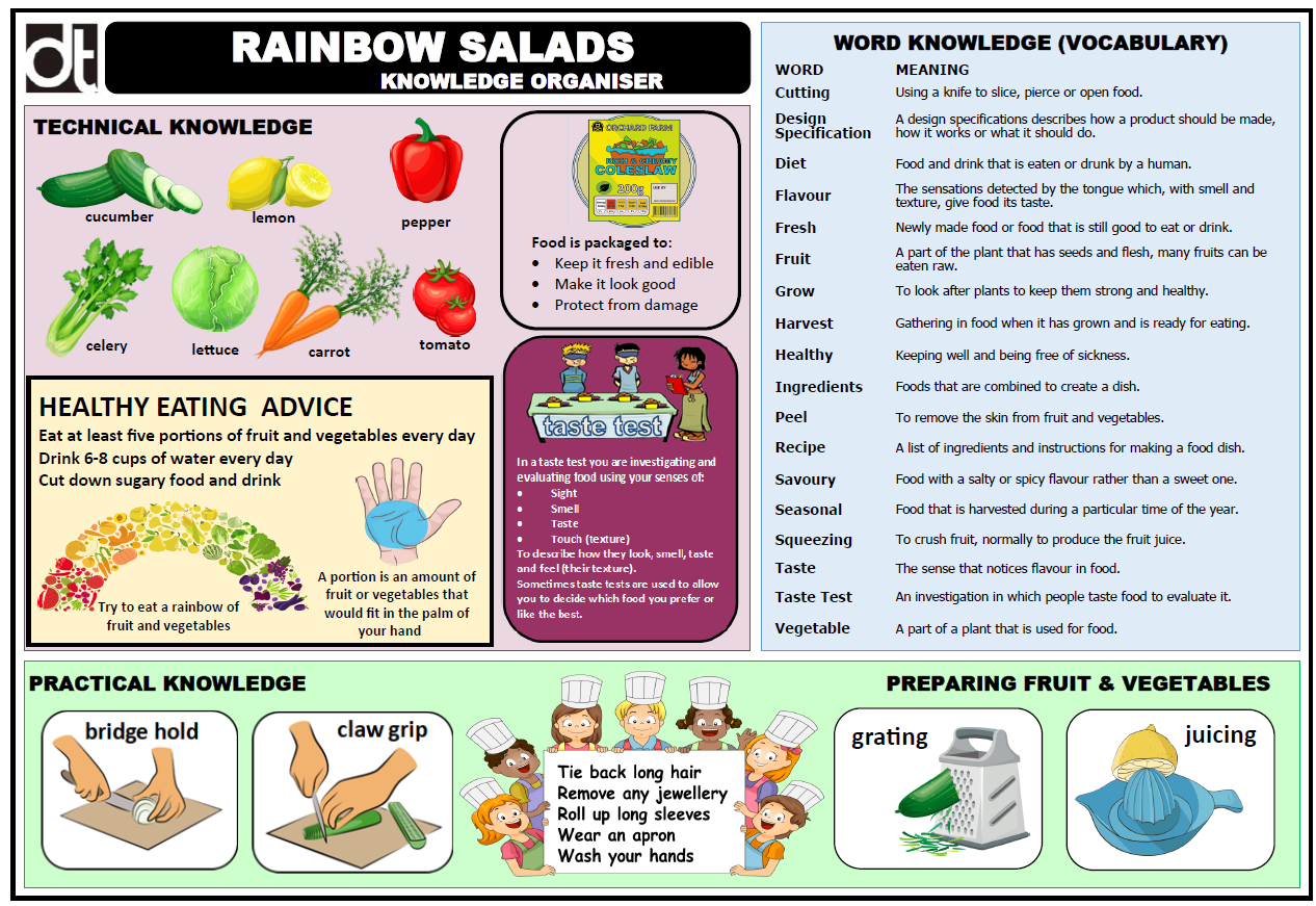 In this unit of work children extend their knowledge of food preparation by designing and making a healthy rainbow salad of five fruits and vegetables. This unit provides an opportunity for children to consolidate their food cutting skills and to extend these skills to include grating and juicing fruit and vegetables. Children begin by taste testing some salads that can be bought in the local supermarket before going on to create their own healthy salad product. They learn the key healthy eating message of eating five portions of fruit and vegetables daily and choosing these from a rainbow of colours. They learn how adding additional ingredients and a dressing can improve the taste of their salads. Having decided upon their salad ingredients they write the recipe which they then use to make their salad. Having evaluated the rainbow salad they made, they complete this project by designing simple packaging and labelling for the product they have created.