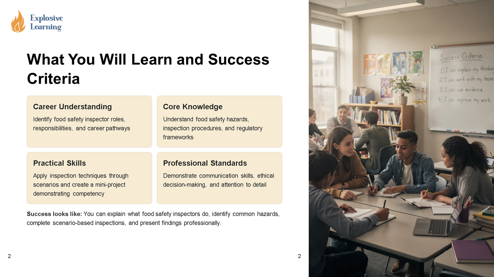 – Success criteria: Students can describe the Food Safety Inspector Career Exploration Mini Project An engaging guide for role using key vocabulary and connect skills and training to the pathway.