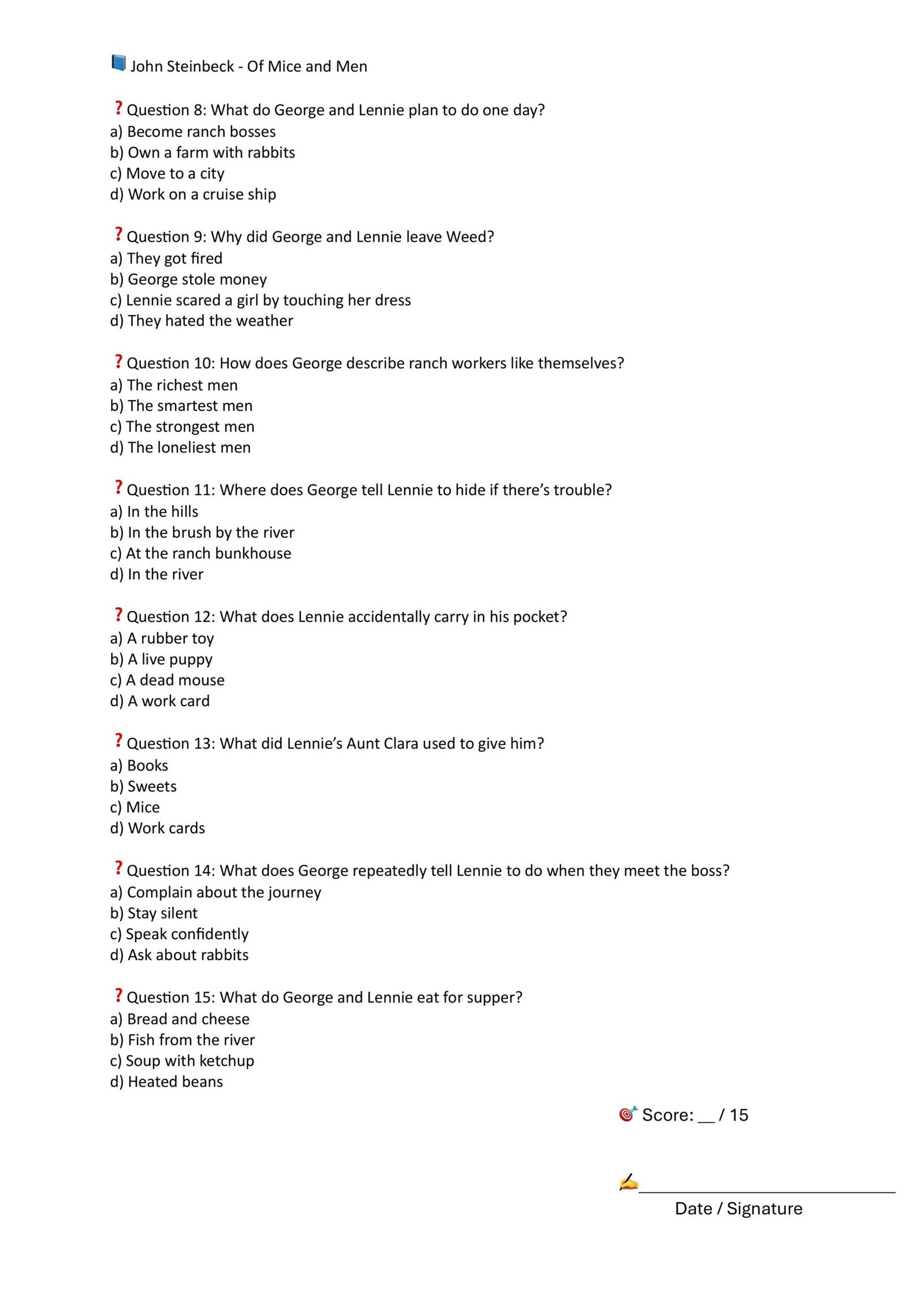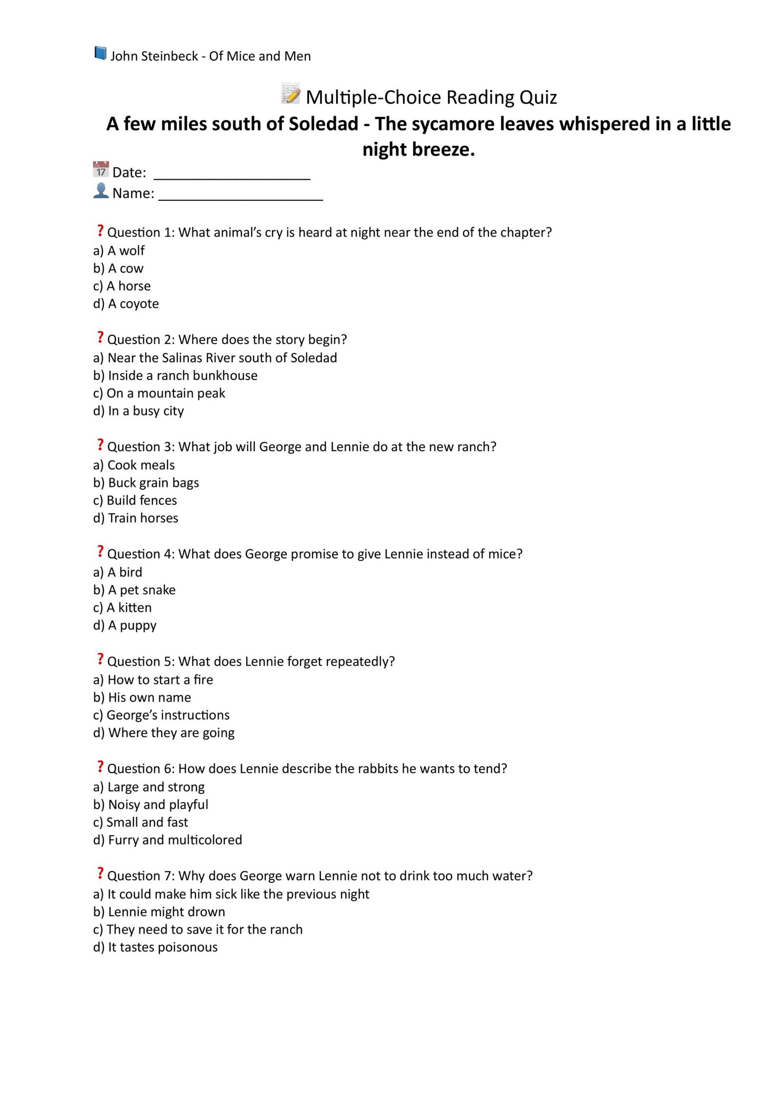 This resource provides ready-to-use comprehension quizzes for John Steinbeck’s Of Mice and Men, divided into six manageable sections. Each quiz focuses on key events, characters, and themes, making it straightforward to check understanding step by step.
