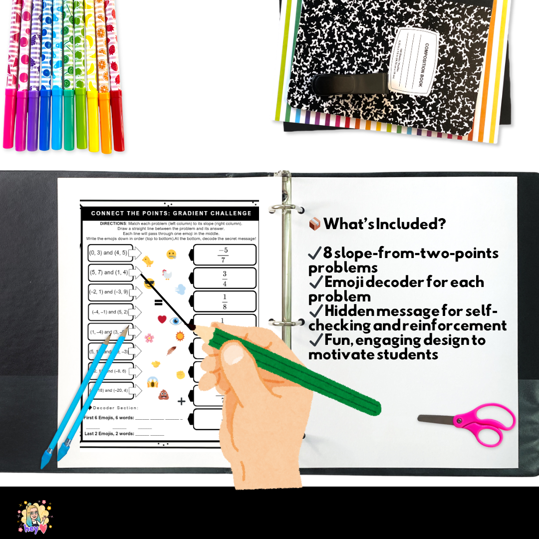 This no-prep activity turns learning about gradients and linear equations into a lively, emoji-filled puzzle that keeps students engaged from start to finish.