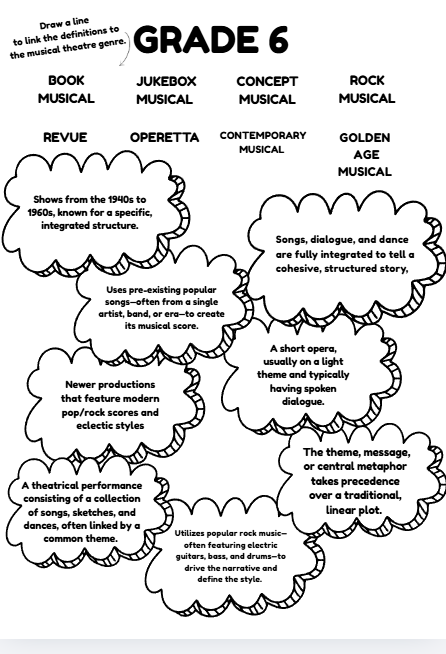 Worksheets to support preparation of the knowledge part of the Musical Theater examinations (London Academy of Music and Dramatic Art syllabus).