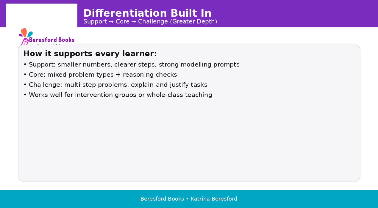 Support: scaffolded steps, smaller numbers, guided modelling