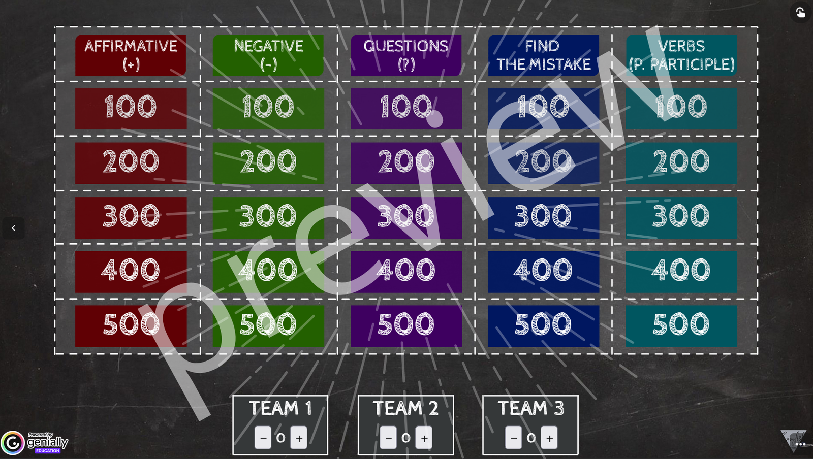 There are five categories in the game: affirmative sentences, negative sentences, questions, find the mistake, verbs (p. participle).