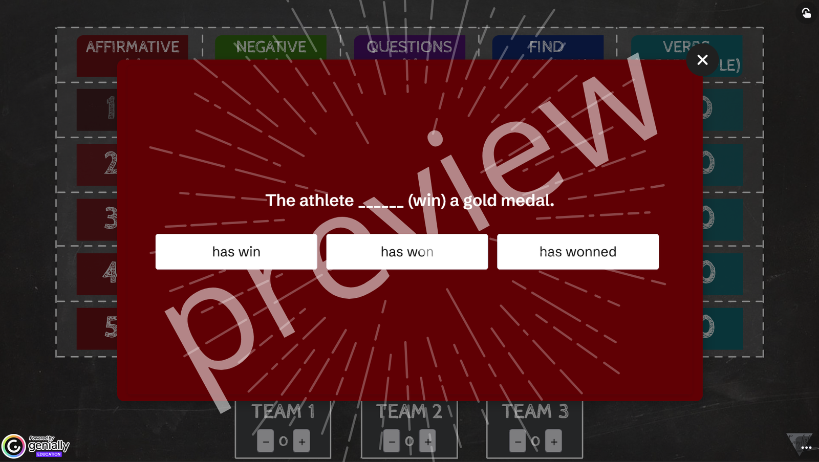 The Present Perfect Game Show is an interactive online team game created for use in the EFL/ESL classroom. It is aimed at secondary school pupils (age 12-15).