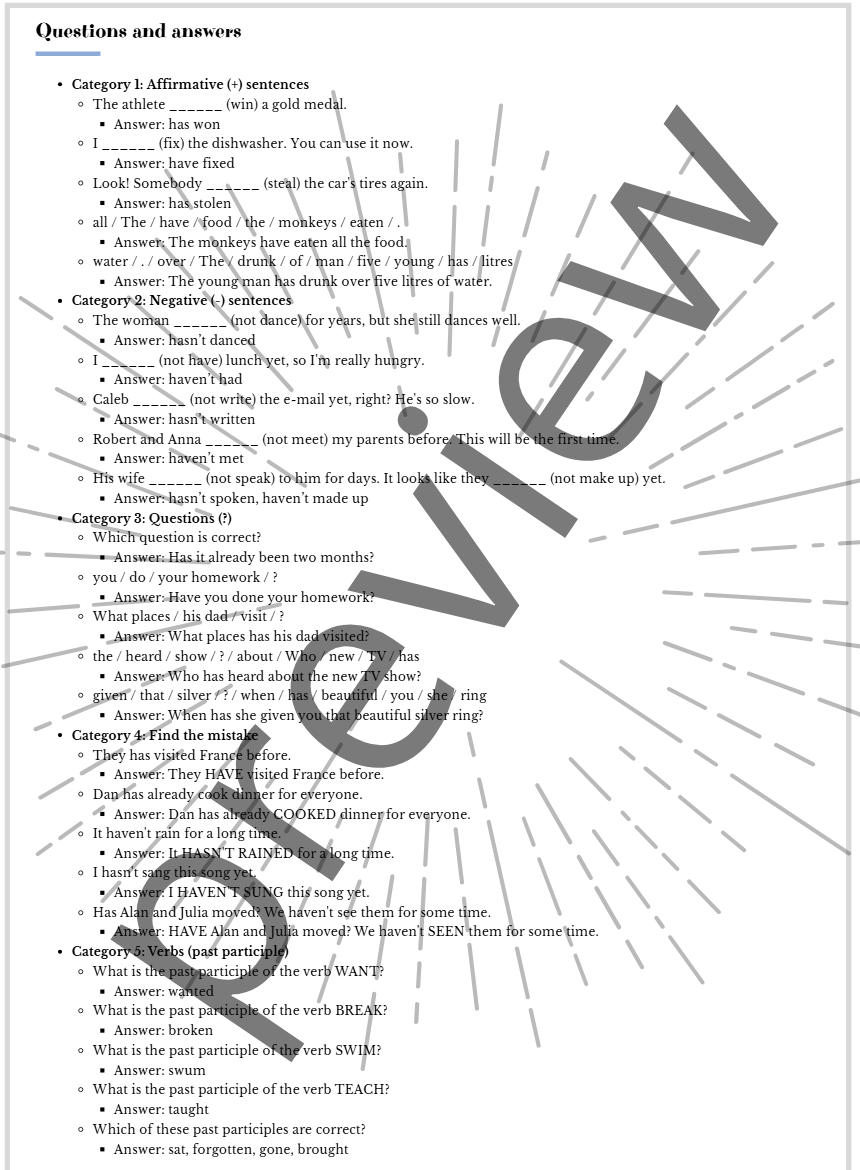 Each category has 5 questions and there are multiple types of questions (short answer, single choice, multiple choice, make a sentence/question).