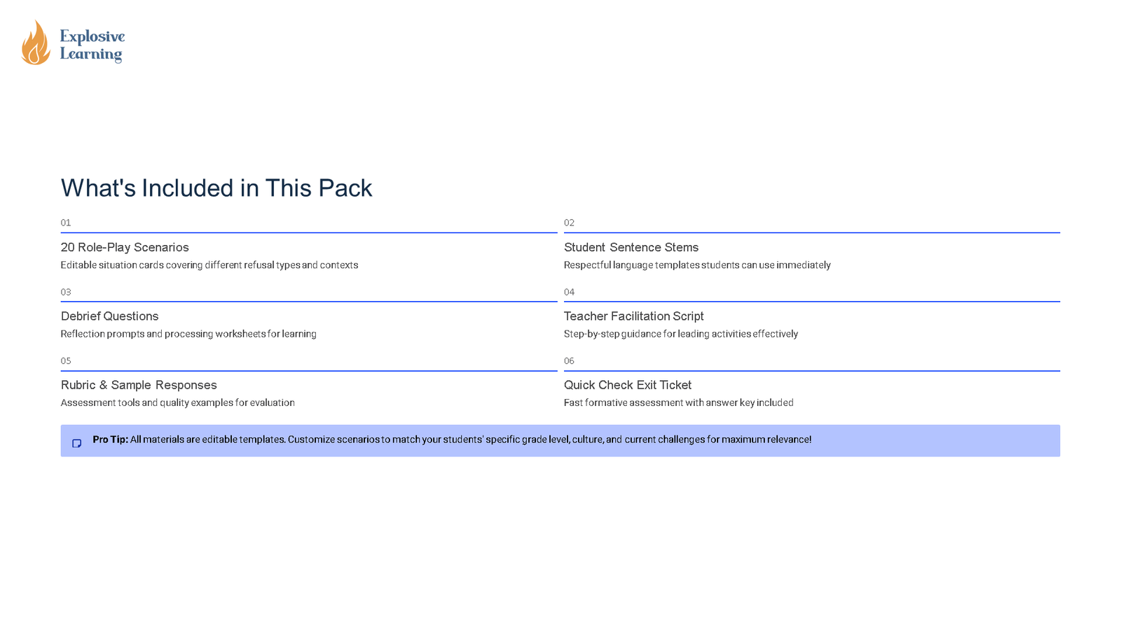 – Reflection or exit task: Students explain what they learned about Responding to Refusal to Work Scenario Practice Pack practical SEL toolkit and use evidence from the lesson to support their thinking.