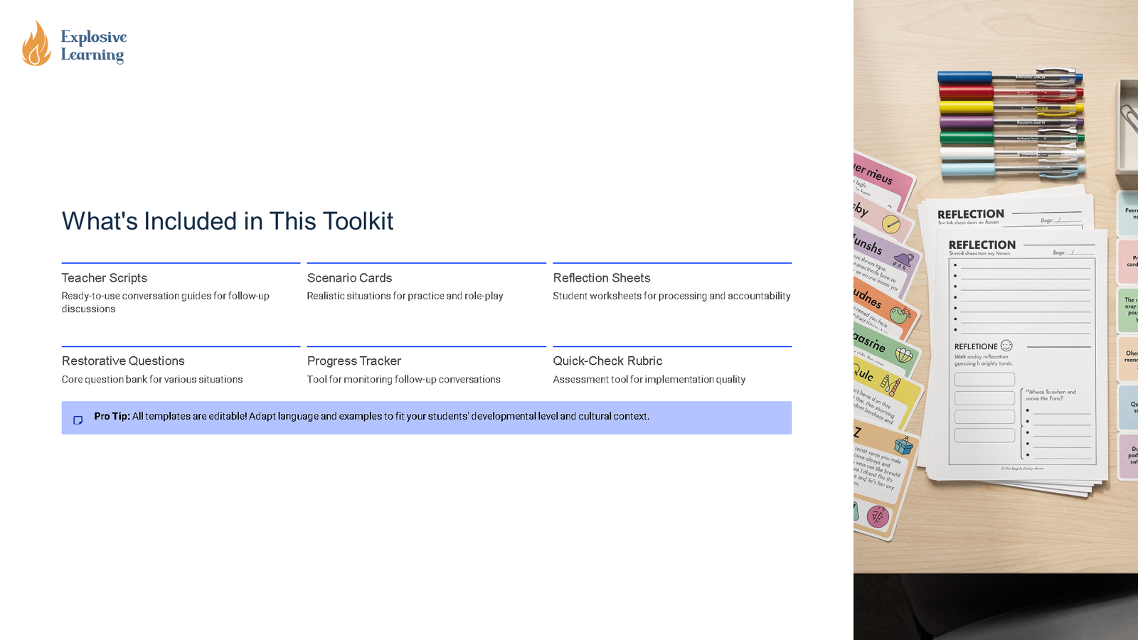 This editable classroom resource is designed around Restorative Follow Up Implementation Toolkit classroom ready guide for. It supports teaching through structured slides, discussion, and practical reflection so students can build understanding in a clear, manageable way.
