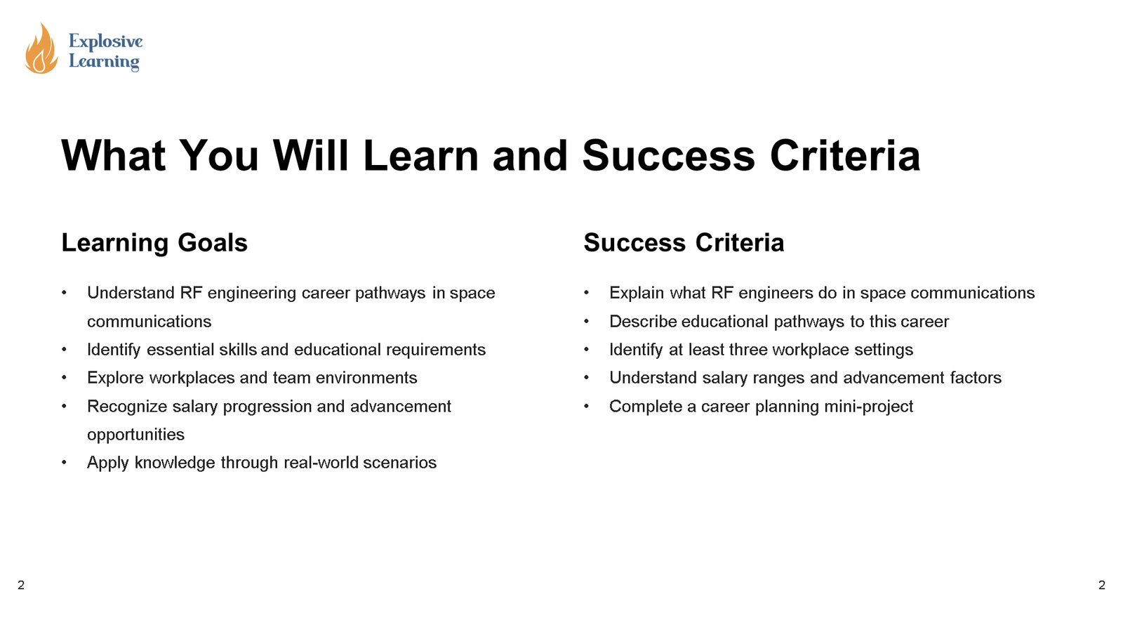 – Success criteria: Students can describe the RF Engineer Space Comms Career Exploration Designing and managing radio role using key vocabulary and connect skills and training to the pathway.