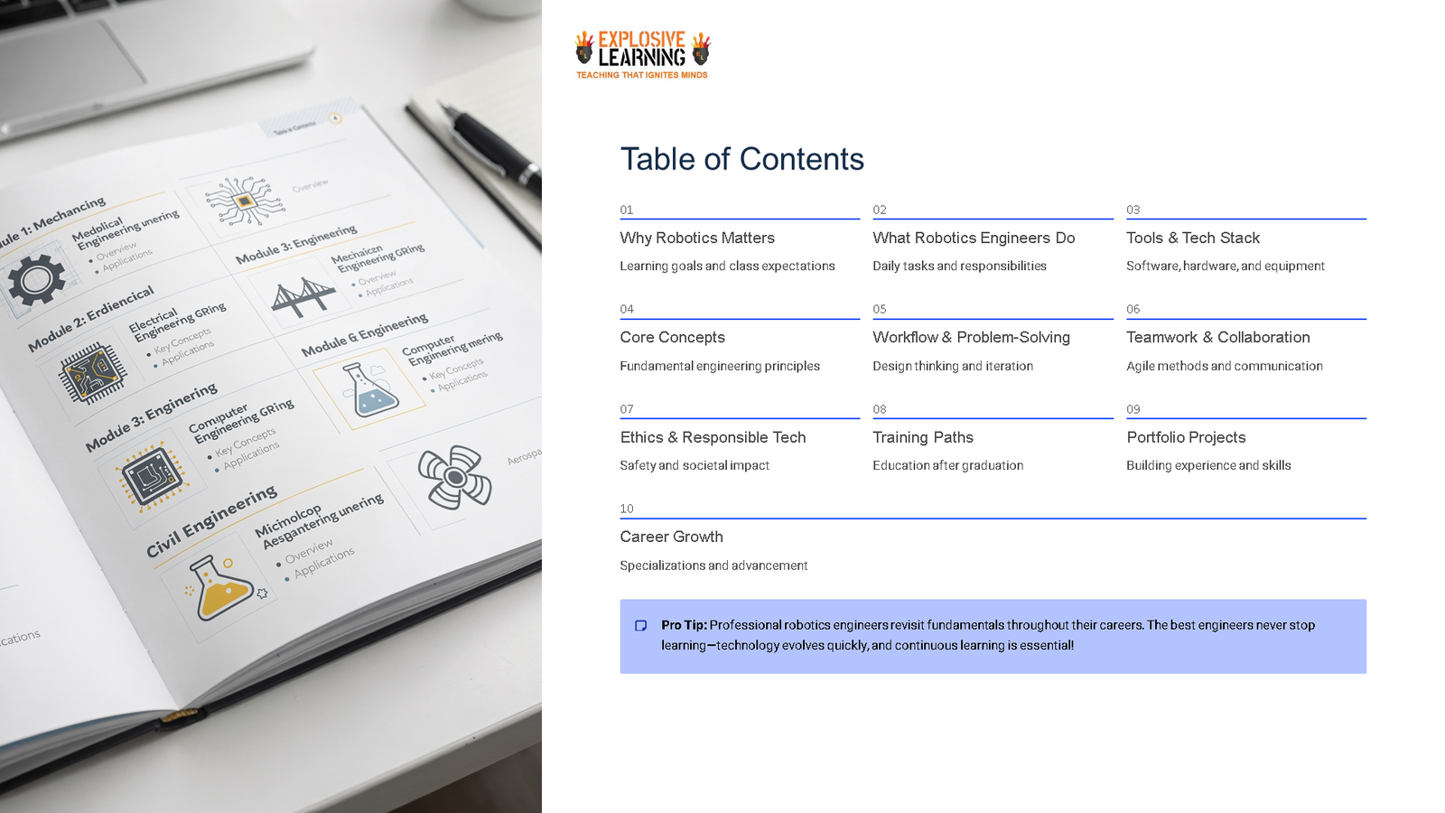 This Career Exploration 101 PowerPoint helps students understand what it is like to work as a Robotics Engineer Career Exploration comprehensive guide for. Students explore responsibilities, work settings, tools, and the skills that matter most.