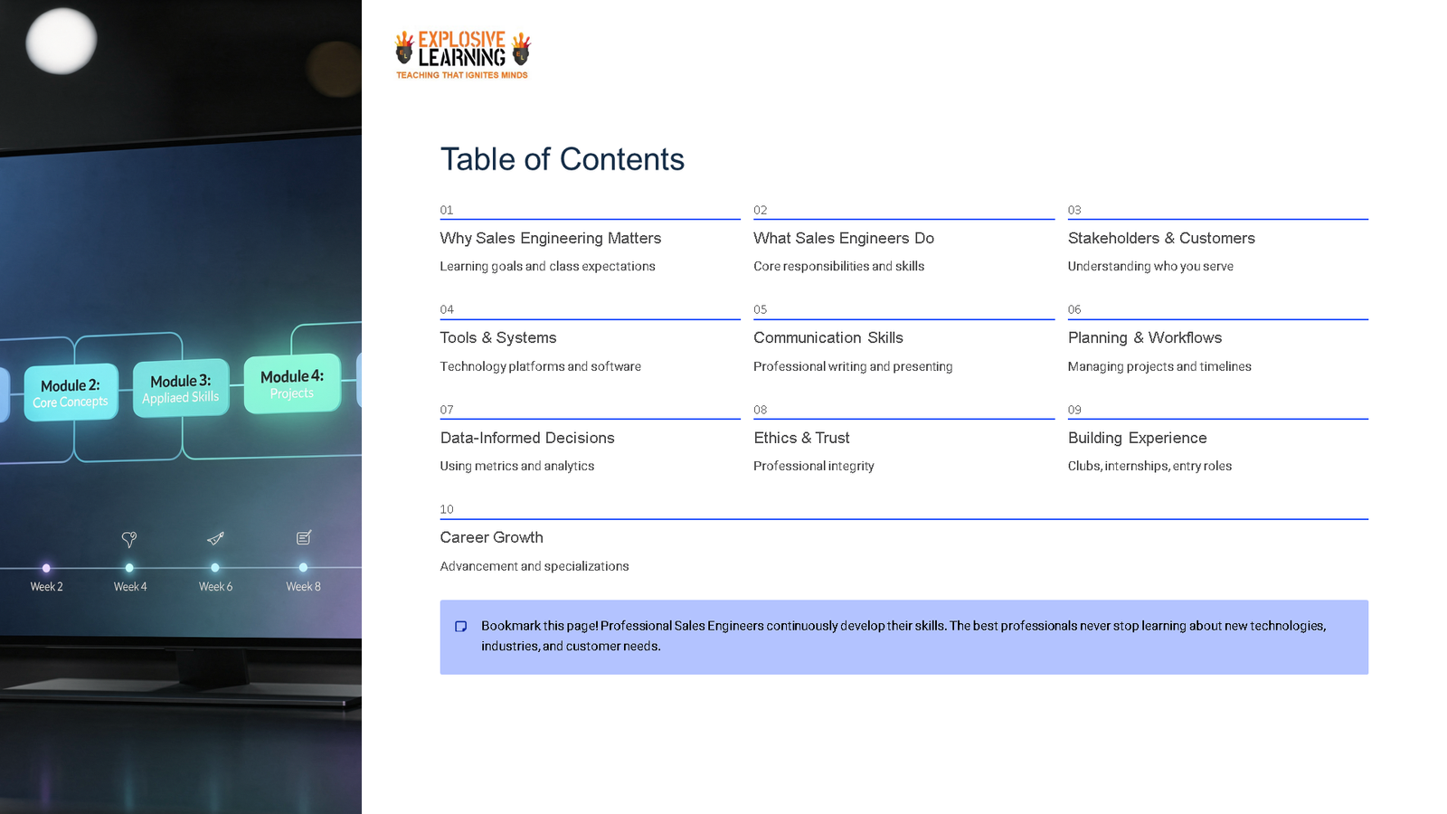– Success criteria: Students can describe the Sales Engineer Career Exploration comprehensive guide for role using key vocabulary and connect skills and training to the pathway.