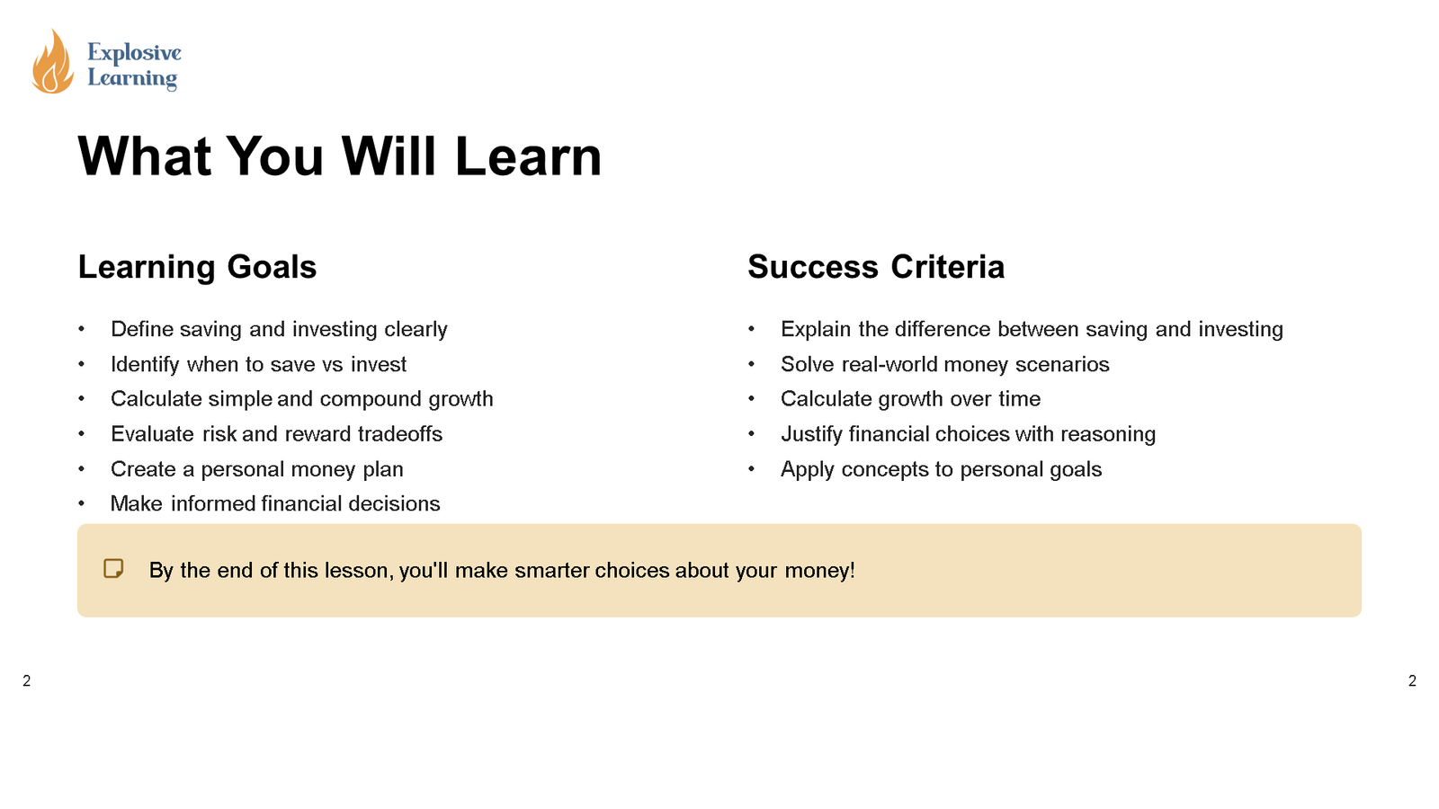 – Reflection or exit task: Students explain what they learned about Saving vs Investing Basics Building Your Financial Future and use evidence from the lesson to support their thinking.
