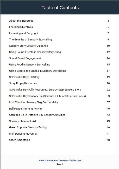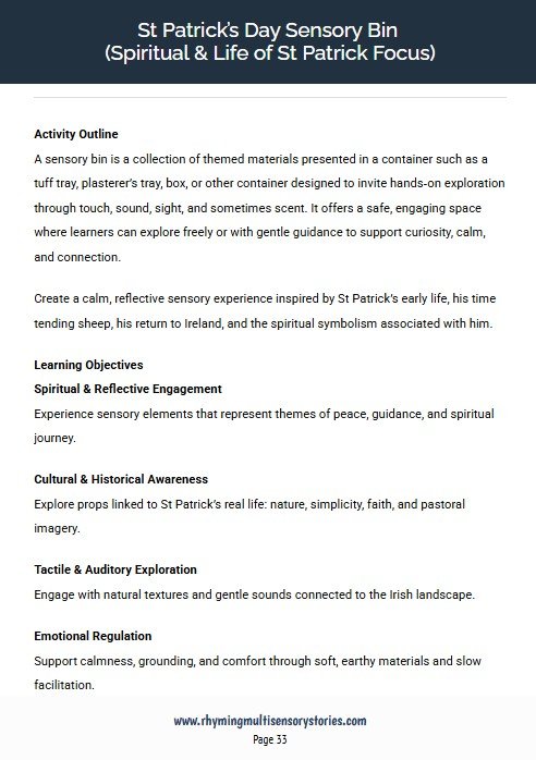 The pack includes a step‑by‑step sensory story, a spiritual and life‑of‑St‑Patrick sensory bin, and a wide range of themed activities designed to support engagement, anticipation, communication, and delight. Learners can explore tactile crafts, sensory baking, Irish dancing, drumming, dressing‑up fun, and calming reflective moments.