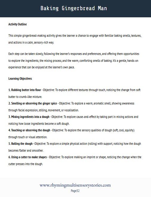 Every element of the story is broken down into practitioner‑friendly steps so you can confidently deliver an immersive, inclusive Gingerbread Man experience that engages the senses, builds communication and supports meaningful learning.