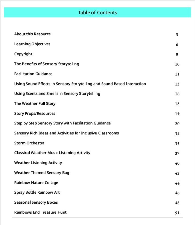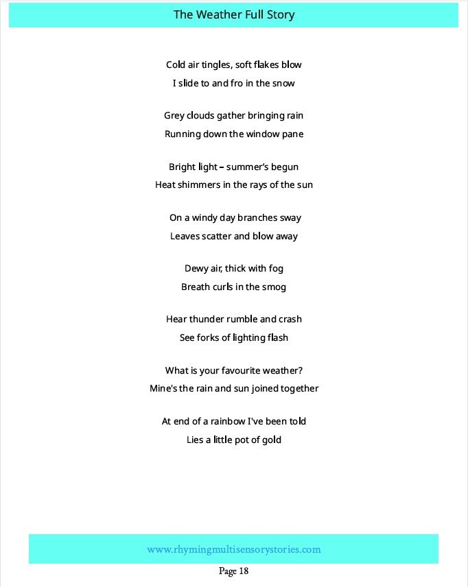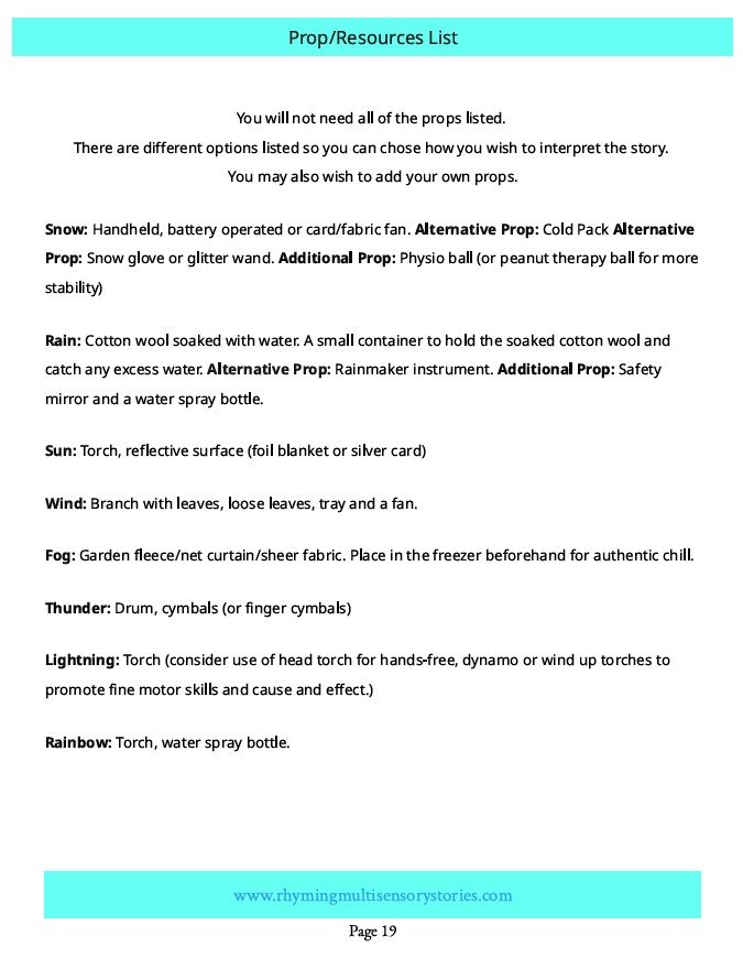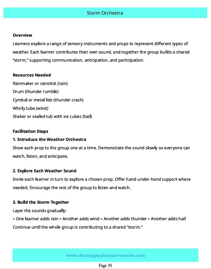 This sensory story can be used as a standalone sensory experience for exploring a topic or theme or as part of a daily circle time routine, offering learners a rich, multisensory way to explore the topic of the weather or the changing seasons. The gentle rhythm, simple language, and sensory cues help learners connect with concepts such as rain, wind, fog, snow, sunshine, storms and rainbows in a meaningful, accessible way.