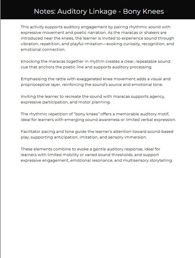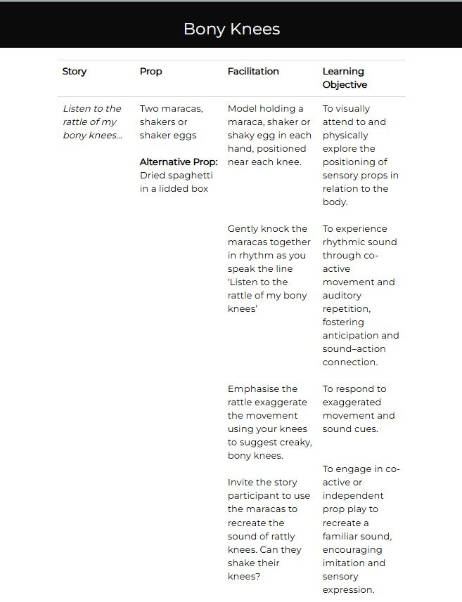 Whether it’s watching torchlight shine on a witch’s face, listening to the rattle of bony knees, or smelling the scent of a bubbling cauldron, this story honours every glance, giggle, and gesture. Affirming language supports rejection and choice, while rhythmic couplets and prop play invite learners to participate at their own pace, explore and connect in a space where every sense is welcome.