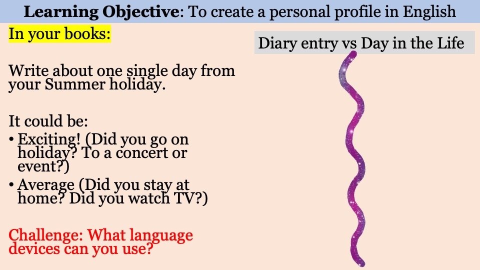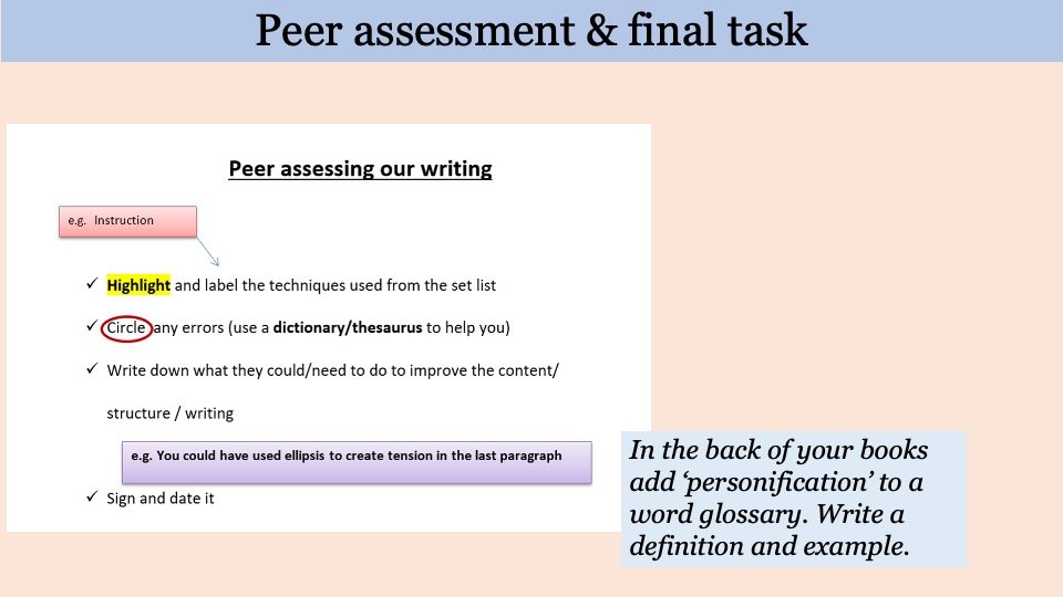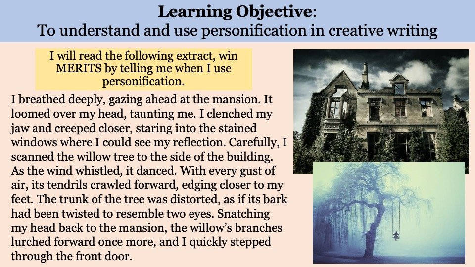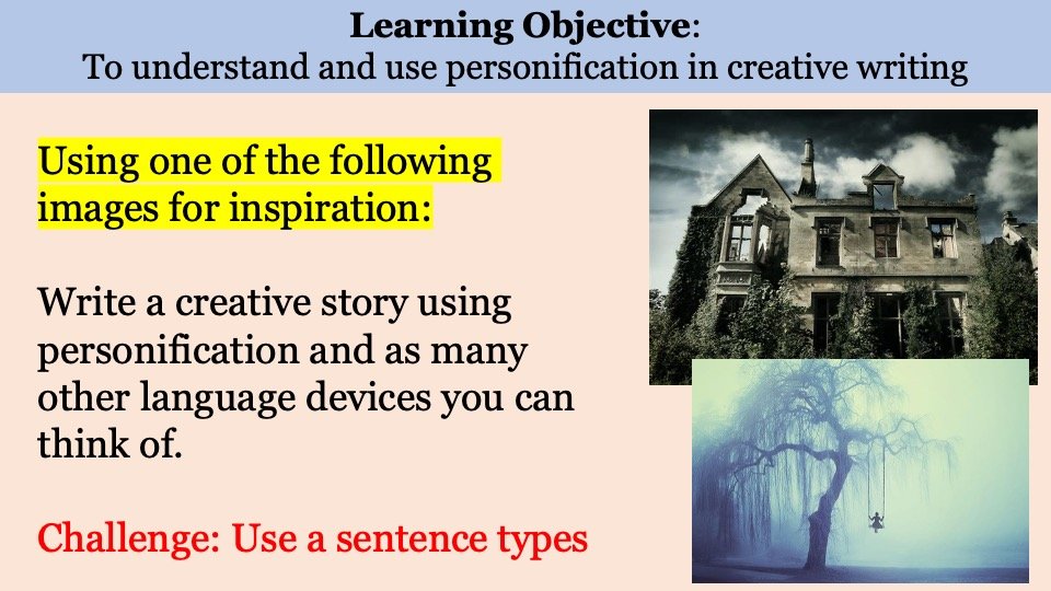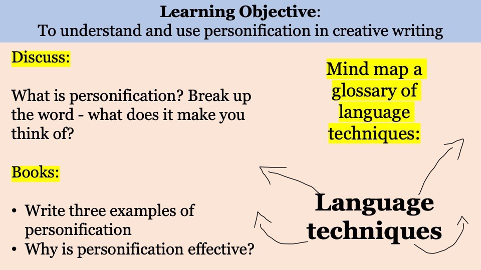 You’re preparing for your first Year 7 class. Use the following Power Point and begin by introducing yourself and encourage your pupils to do the same by creating a personal profile. Establish your ground rules to set a positive classroom environment. Then, move on to exploring personification: examine examples of effective use and use these as inspiration for your pupils to write their own creative stories.