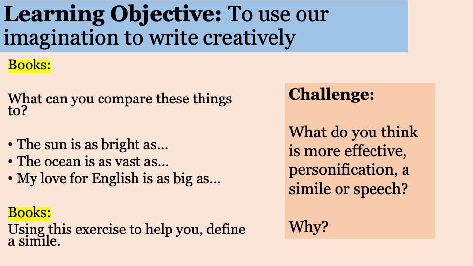 It’s your first week with Year 7! Use this PowerPoint to guide students in understanding how to use similes effectively in their creative writing. Engage them in unique, imaginative activities that challenge their creativity and help build the foundational skills of strong storytelling.