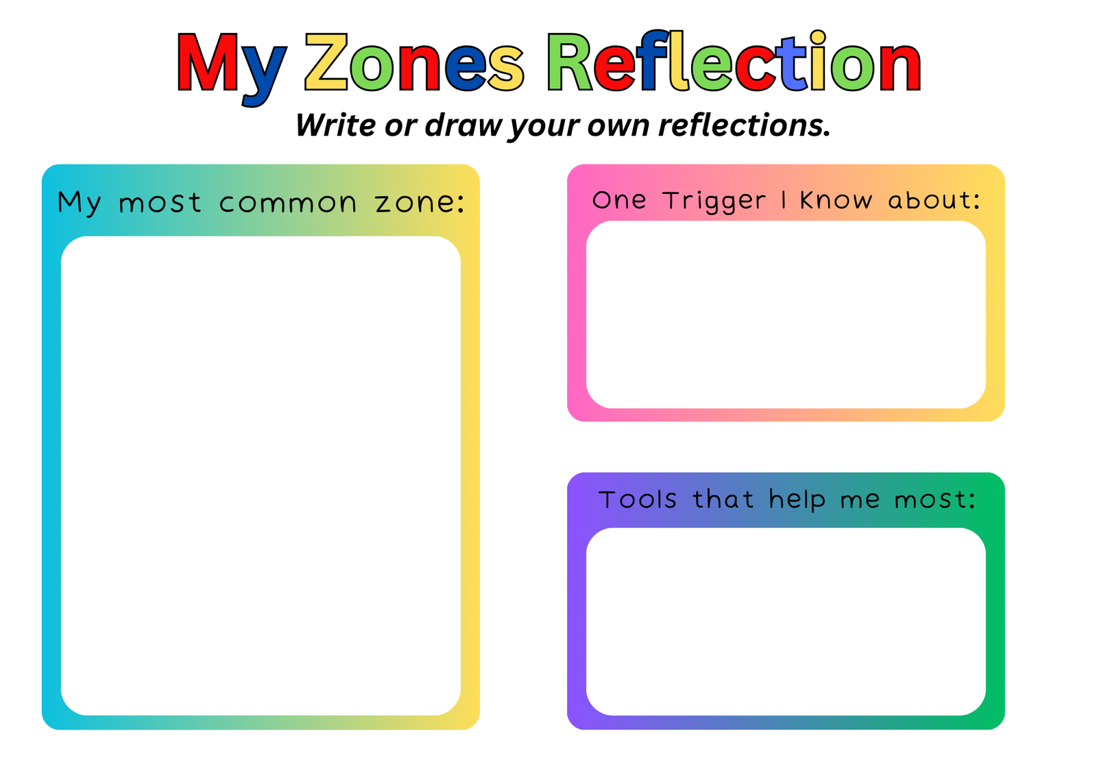 • Each child is encouraged to have their own Zones of Regulation folder, where they can keep all worksheets, visuals, and reflection activities. This helps children build ownership of their learning and provides a valuable reference they can return to over time.